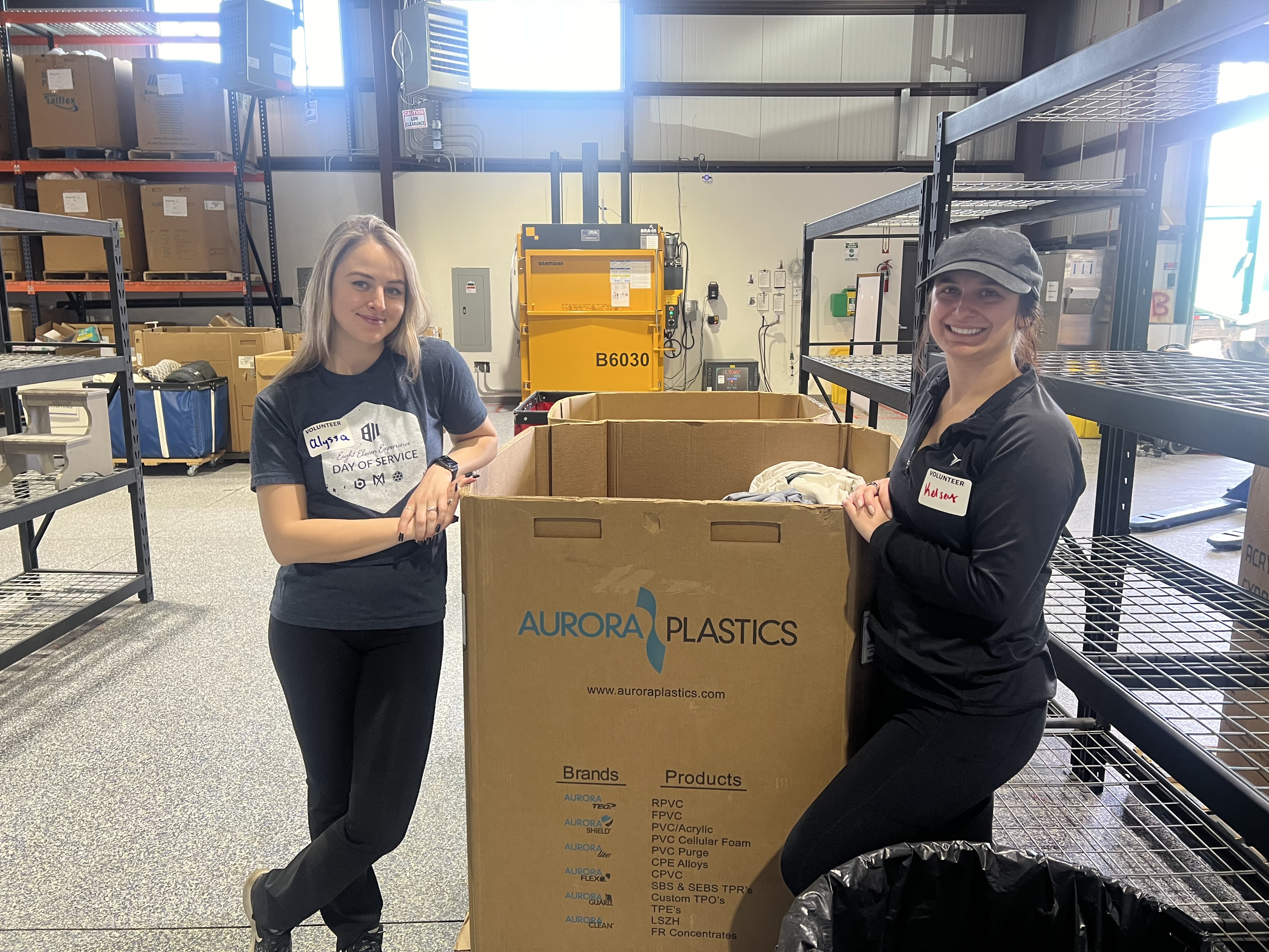 September 2022: Alyssa Hall and Kelsey Smith pose for a picture after sorting donations for A Precious Child during Eight Eleven’s E3 Day of Service.